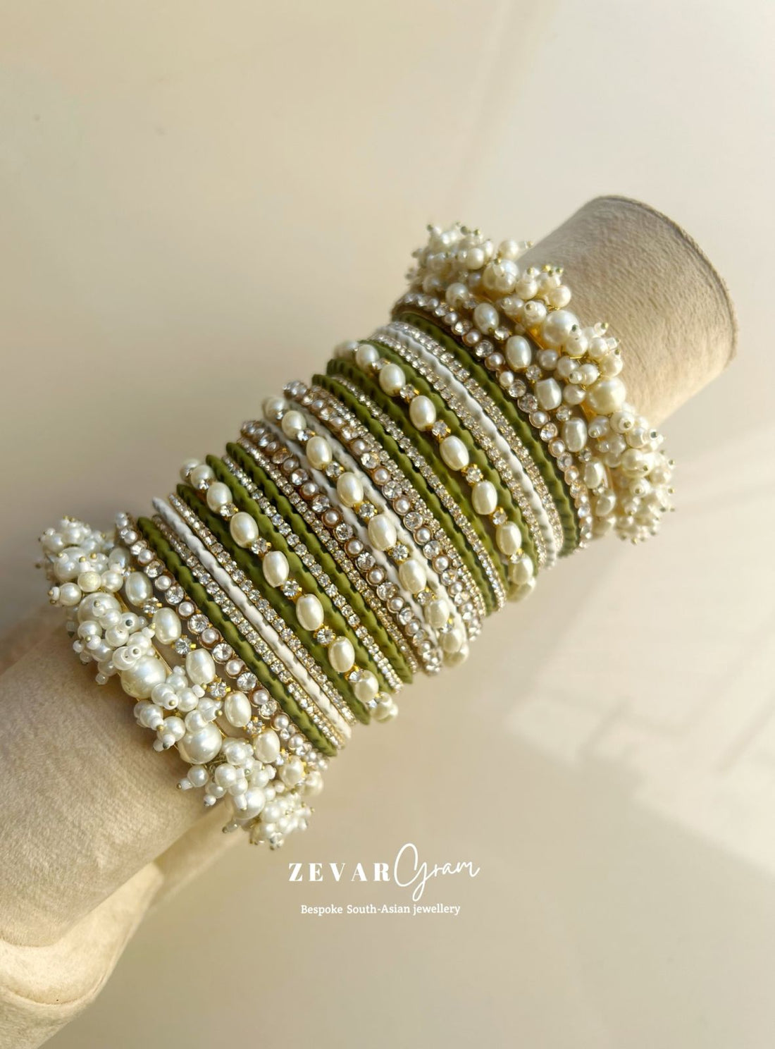 Our Best seller Pearl luxe Bespoke bangles set is designed using handcrafted gajra bangles, handpicked...